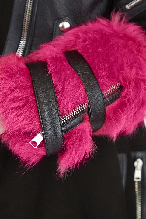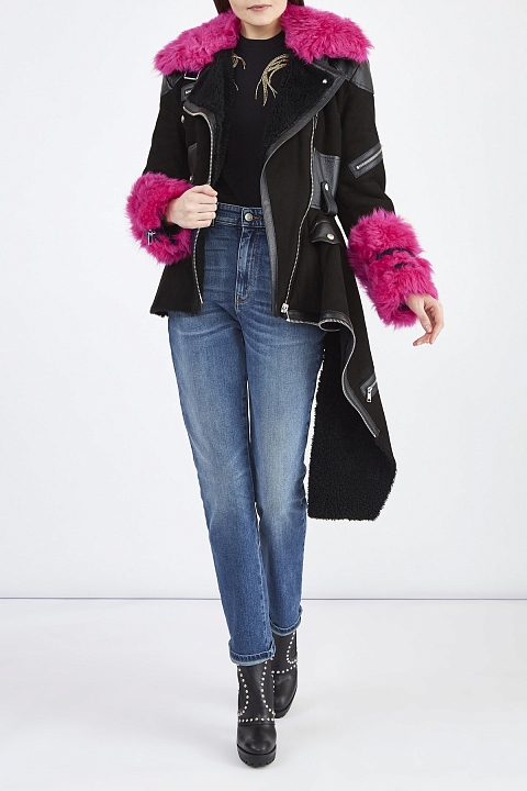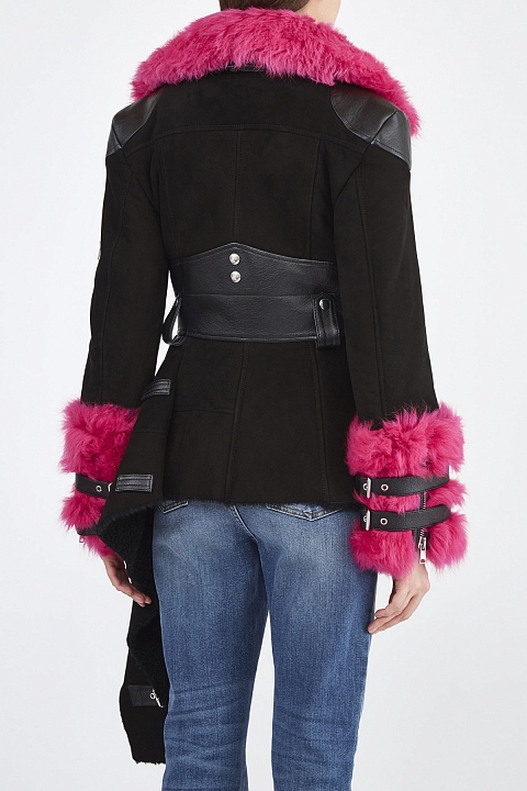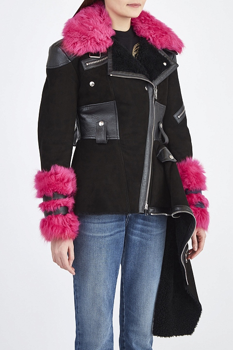 Дубленка в байкерском стиле от Alexander McQueen выполнена из замши и кожи ягненка в черном цвете. Изделие удлиненного с помощью баски силуэта с лацканами, асимметричной линией застежки и массивными молниями. Фирменный деконструктивизм подчеркнут асимметричным драпированным подолом и декором в виде молнии по кромке. Яркие акценты в образ вносит отделка из меха ягненка оттенка фуксии на вороте и рукавах. Сделано в Италии.