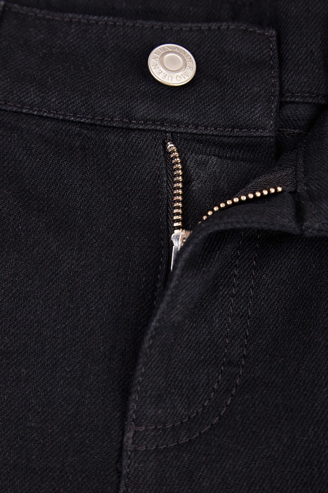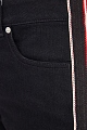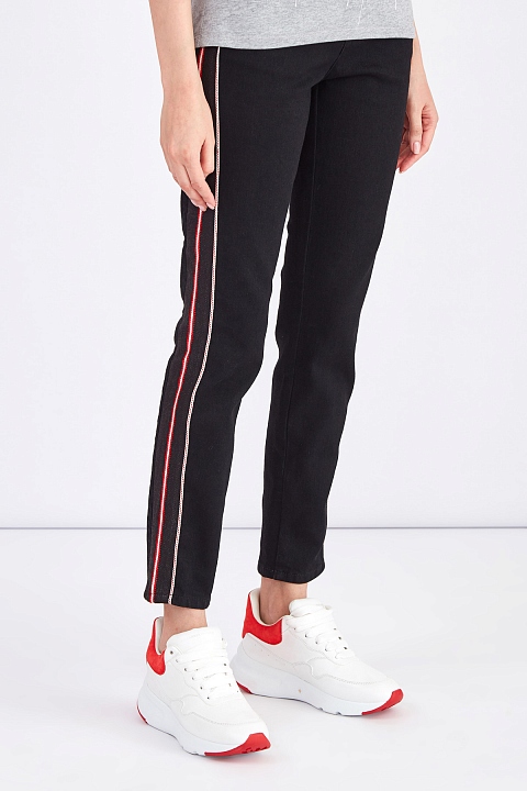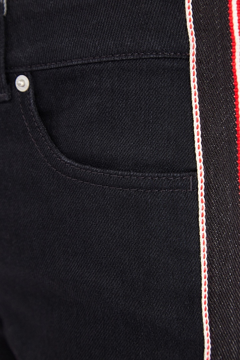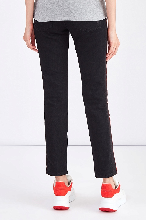 Укороченные женские джинсы прямого кроя из коллекции осень-зима от Alexander McQueen созданы из хлопкового денима, равномерно окрашенного в глубокий черный цвет. Эластичные волокна в составе позволяют сделать материал более гибким, сохранив ценные свойства натурального хлопка. Высокая посадка формирует гармоничный силуэт. Спинка изделия декорирована вышитой монограммой бренда, выполненной шрифтом в фирменном готическом стиле. Образ в стиле спортшик позволяют создать контрастные лампасы по боковым швам, выполненные из тканой ленты с окантовкой алого и льняного оттенков. Классические пять карманов и застежка на пуговицу и молнию завершают модель. Сделано в Италии.