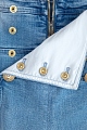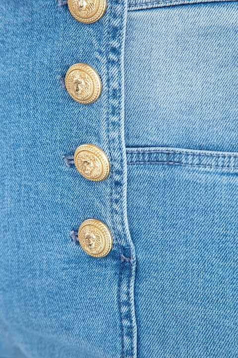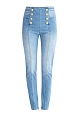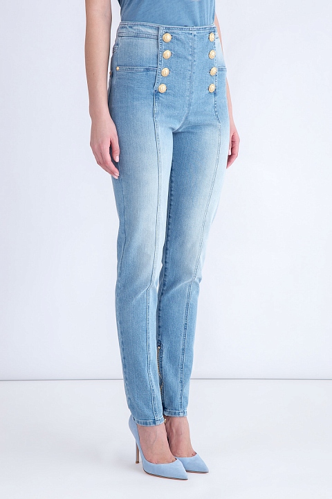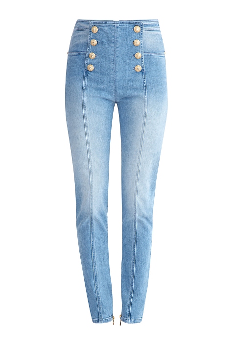 Винтажные женские джинсы из весенне-летней коллекции Balmain выполнены из денима классического голубого оттенка с эффектом потертости. Настроение эпохи 80-х задает декор фирменными пуговицами оттенка античного золота с тисненным изображением льва и хлястик на спинке изделия. Высокая посадка, зауженный крой, а также объемные продольные швы формируют гармоничный и строгий силуэт. Изделие дополнено застежками-молниями на нижних кромках модели.