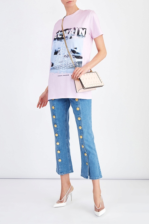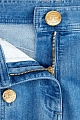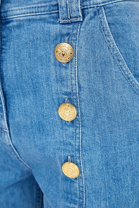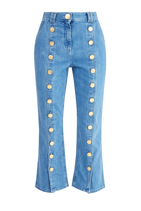 Укороченные джинсы расклешенного от колена кроя от Balmain созданы из эластичного хлопкового денима в традиционном голубом оттенке. Особенностью модели стала отделка фирменными массивными пуговицами вдоль передних планок. Детали: диагональные карманы по бокам, накладные карманы на спинке, фурнитура с золотистым напылением, застежка на пуговицу и молнию.