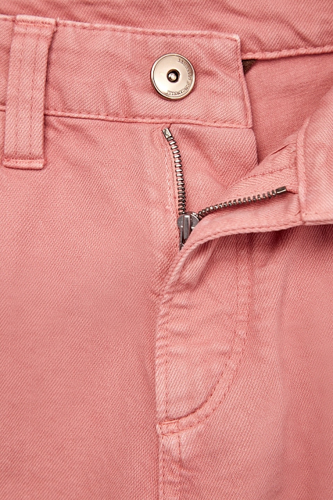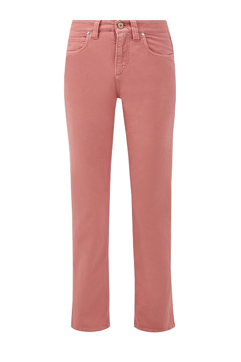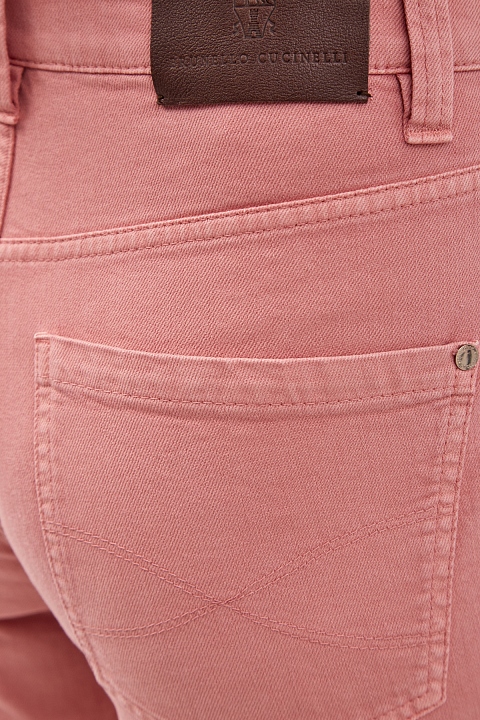 Джинсы-slim Straight Leg от Brunello Cucinelli выполнены в пудрово-розовом оттенке из комфортного денима Soft — плотная ткань с четкой структурой в результате специальной обработки остается комфортной в носке. Окрашивание в готовом виде придает изделию легкий графический эффект в области швов. Вышивка Мониль на отворотах стилизована под кромку селвидж. Детали: застежка на пуговицу и молнию, пять карманов, средняя посадка. Сделано в Италии.