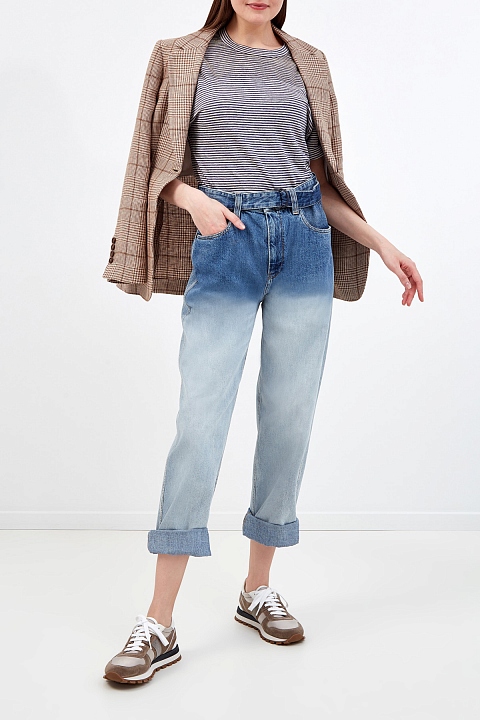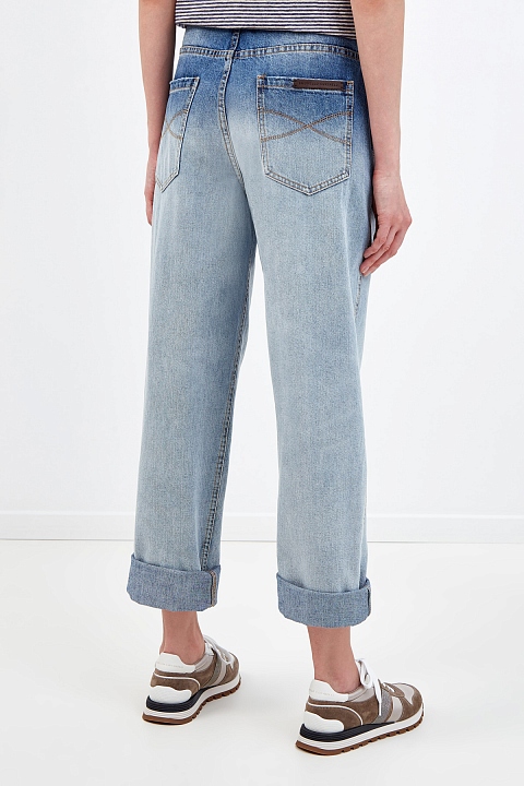 Укороченные джинсы от Brunello Cucinelli выполнены из денима Authentic — ткани с плотной, и в то же время мягкой текстурой. Эффект деграде достигнут мастерами бренда вручную, что делает каждое изделие уникальным. Модель на высокой посадке с широким кроем брючин идеально подойдет для создания повседневных расслабленных образов. Особенностью модели стал пояс с D-образными фиксаторами. Сделано в Италии.