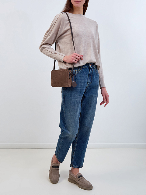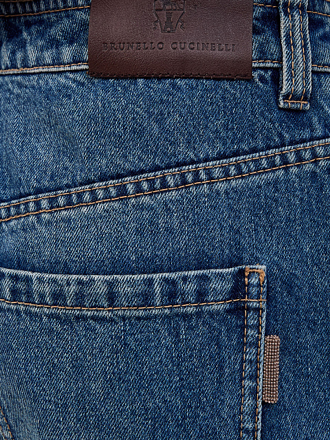 Джинсы Baggy от Brunello Cucinelli сочетают современный свободный силуэт и фирменные детали. Модель создана из полностью натурального хлопкового денима, окрашенного мастерами бренда в готовом виде. Мерцающий штрих — деталь из ювелирных бусин Мониль без содержания никеля на кармане. Детали: пять карманов, нашивка из кожи. Сделано в Италии.