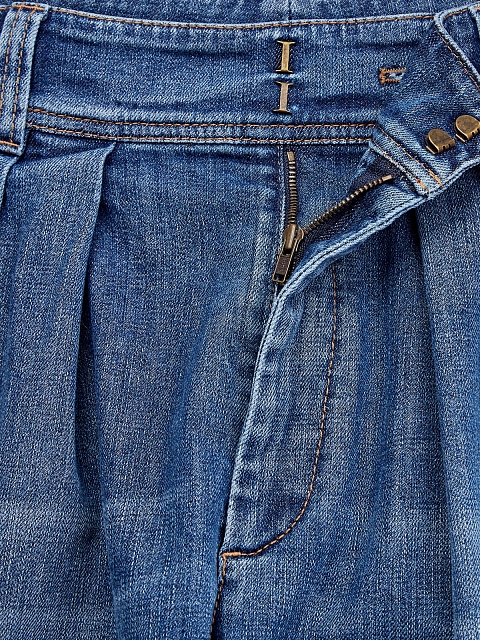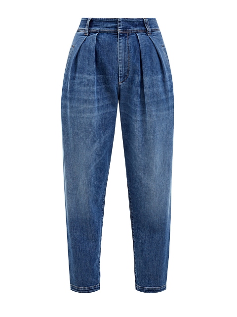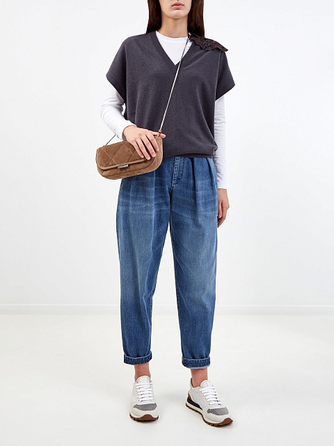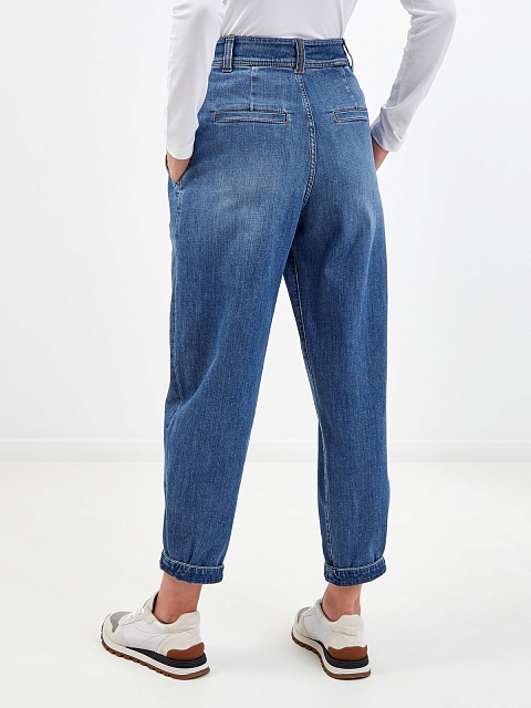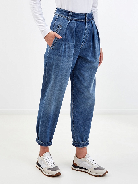 Стильные джинсы Slouchy из хлопкового денима делаве от Brunello Cucinelli. Модель с легким выбеленным эффектом окрашена мастерами бренда вручную, объемный крой с заложенными складками подчеркивает расслабленный стиль изделия. Тонкая вышивка из цепочки Мониль на шлевке вносит в образ изысканный штрих. Детали: высокая посадка, контрастная прострочка швов. Сделано в Италии.