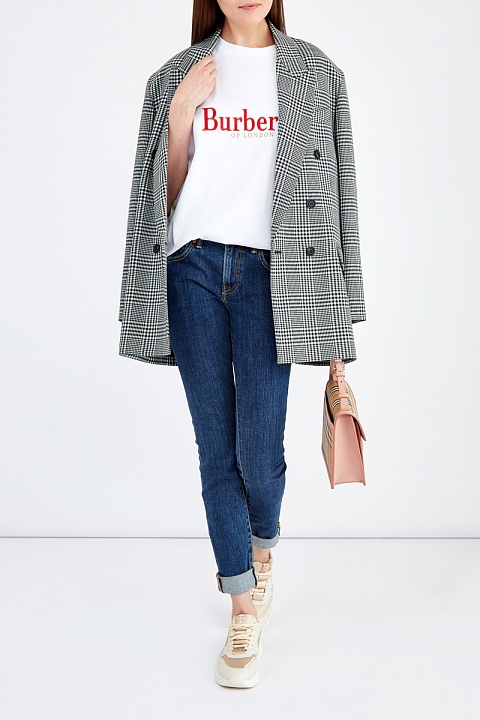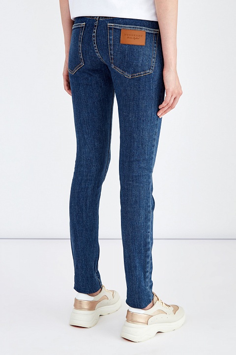 Облегающие джинсы от Burberry выполнены из эластичного японского денима весом 12.8 унций. Модель с эффектом потертости на кромках дополнена прострочкой швов цветными нитями и фирменной фурнитурой. На кармане расположена нашивка из матовой кожи с тисненой монограммой бренда. Детали: традиционная средняя посадка, застежка на пуговицу и молнию.