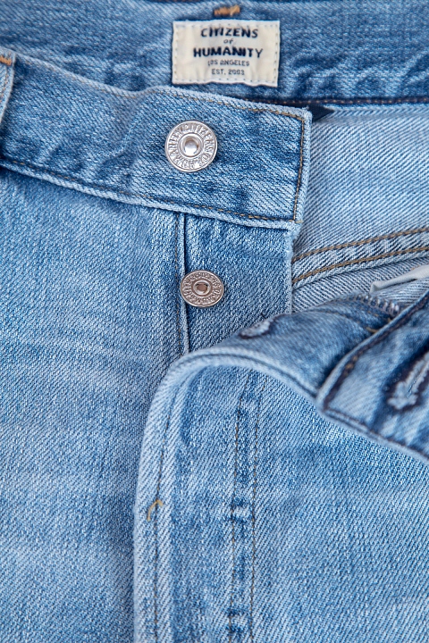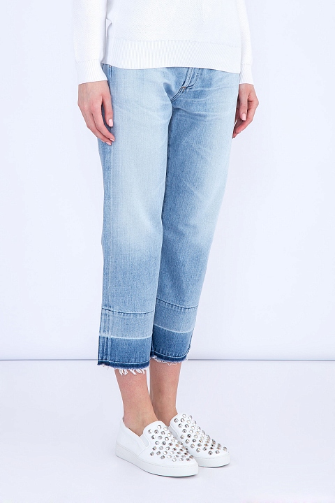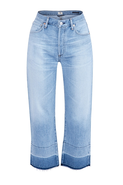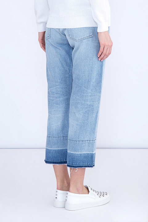 Лаконичные джинсы wide leg от Citizens of Humanity сочетают в себе новый классический дизайн. Модель изготовлена из хлопкового денима с потертостями и неравномерно окрашенной кромкой брюк. Отличительной особенностью модели стала слегка завышенная талия, подчеркивающая преимущества фигуры, и укороченная длина.