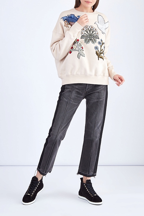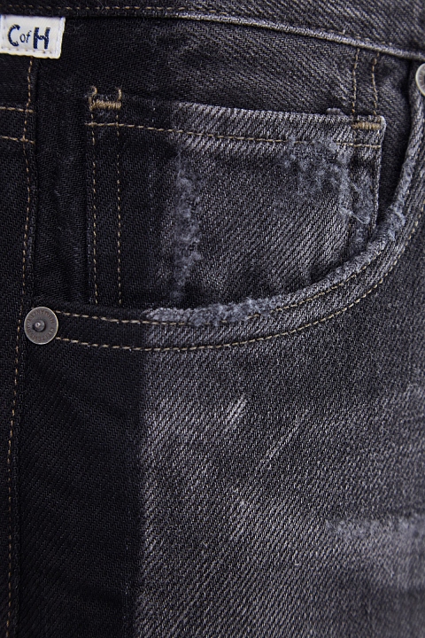 Широкие джинсы со сложным окрашиванием, бахромой и прошитыми стрелками