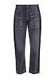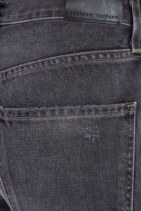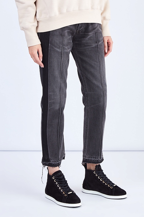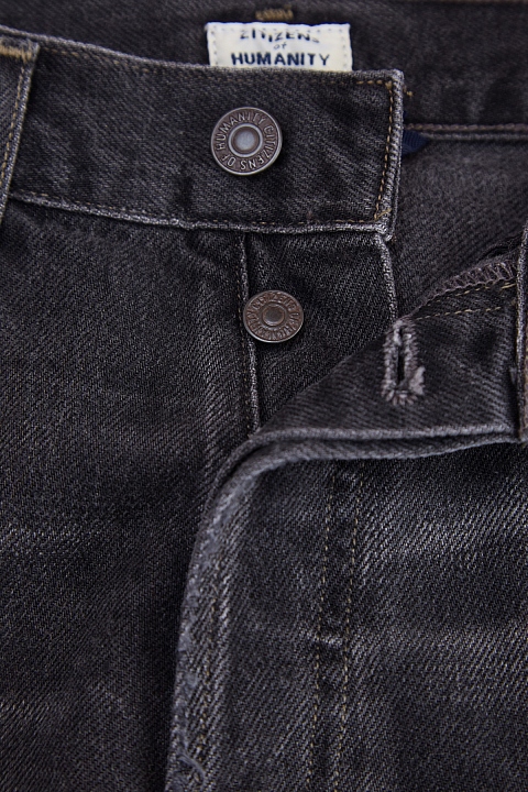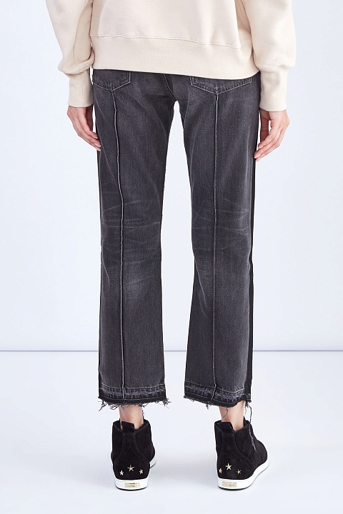 Женские джинсы слегка расклешенного от колена кроя длины 7/8 из весенне-летней коллекции Citizens of Humanity выполнены из плотного неравномерно окрашенного хлопкового денима оттенка графита: особенностью модели стало затемнение в области боковых швов и нижних кромок до насыщенного черного тона. Винтажное настроение изделию придают декоративные потертости и прострочка швов нитями светло-коричневого цвета. Строгий силуэт формируется за счет высокой посадки и простроченных стрелок. Классические пять карманов и застежка на пуговицы завершают образ.