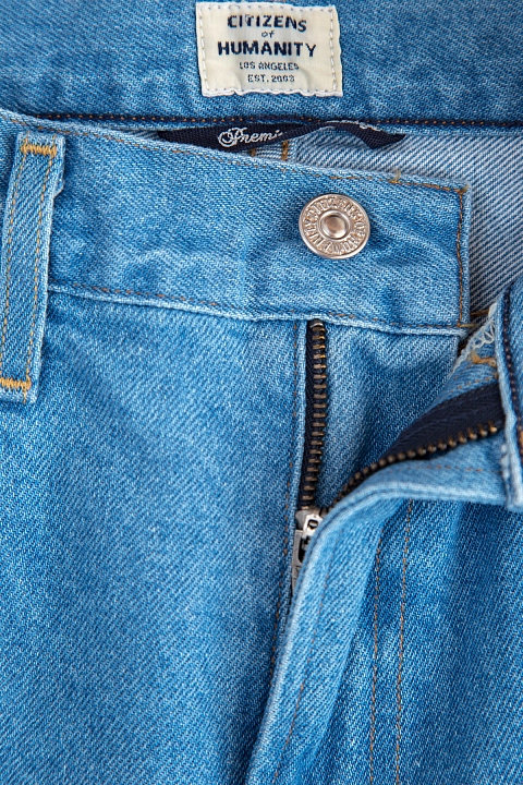 Винтажные женские джинсы расклешенного от колена кроя длины 7/8 из весенне-летней коллекции Citizens of Humanity созданы из равномерно окрашенного плотного хлопкового денима в ярко-голубом оттенке. Декор нижних кромок бахромой и прострочка швов нитями табачного тона придают модели аутентичное настроение эпохи стиля ретро, а выверенный крой формирует гармоничный силуэт. Изделие с классическими пятью карманами и застежкой на молнию и пуговицу.