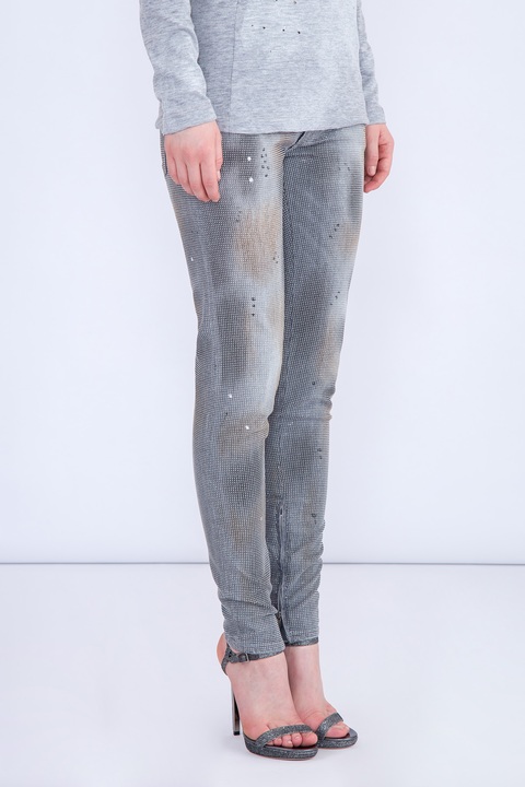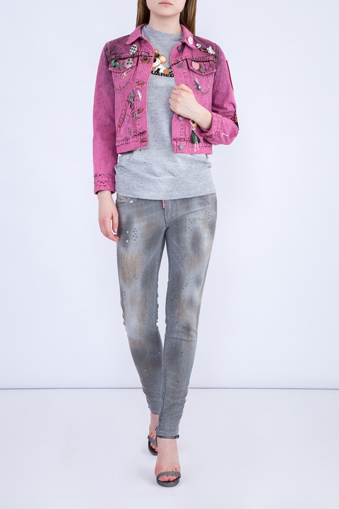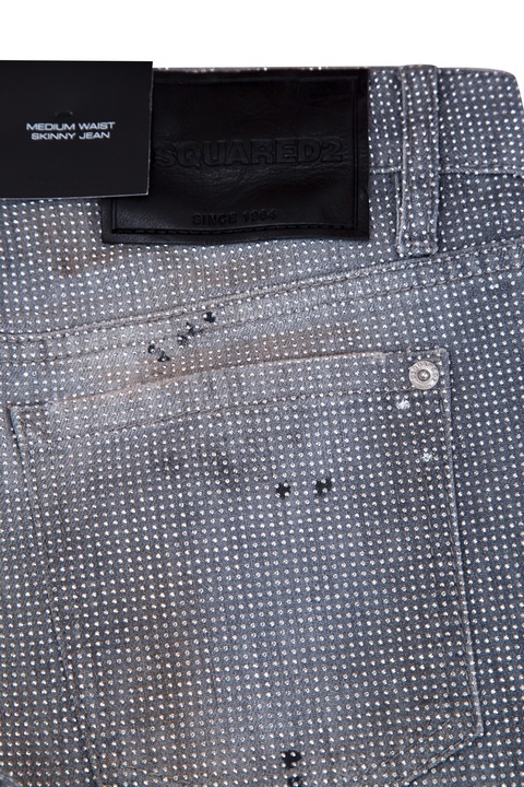 Эффектные женские джинсы skinny из коллекции Dsquared2. Модель выполнена из плотного хлопкового денима серого цвета, украшенного цветным напылением и металлизированным повторяющимся микроузором. Изделие с традиционными пятью карманами, ярлыком с символикой бренда, застежкой на молнию и пуговицу и замочками у нижних кромок.