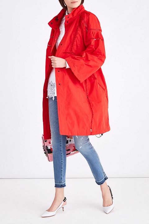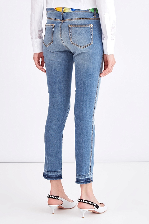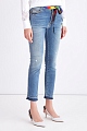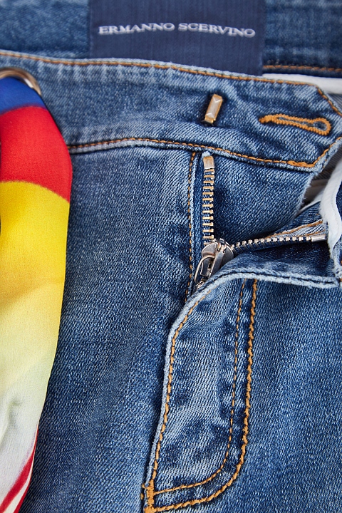 Эффектные укороченные женские джинсы прямого кроя из весенне-летней коллекции Ermanno Scervino созданы из хлопкового денима голубого тона с неравномерным градиентным окрашиванием ткани, который придает модели эффект потертости и дополнены прострочкой швов контрастными нитями табачного оттенка. Модель декорирована аппликациями насыщенных синих, желтых и красных оттенков, которые перекликаются с оригинальным поясом-платком. Нижние кромки выполнены в технике резервного окрашивания и обрамлены бахромой. Классические пять карманов и застежка на пуговицу, металлический крючок и молнию завершают яркий образ. Сделано в Италии.