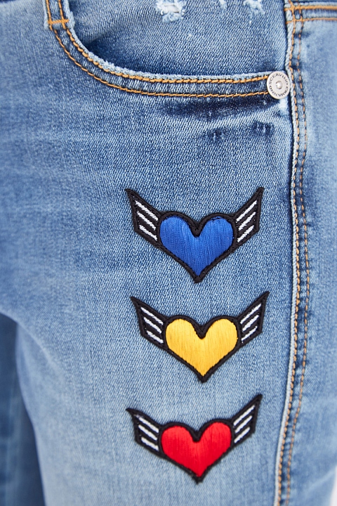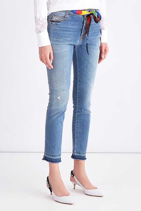 Укороченные джинсы-скинни с поясом-платком и яркими патчами