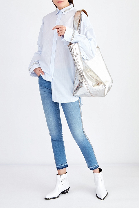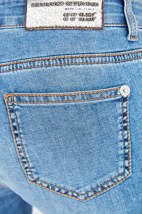 Женские джинсы от Ermanno Scervino выполнены из тонкого хлопкового денима голубого оттенка с эффектом варки и градиентными разводами и дополнены прострочкой швов нитью традиционного табачного цвета. Боковые швы декорированы лампасами, вручную расшитыми бисером. Детали: нижние кромки в технике резервного окрашивания, пять карманов, длина ⅞, нашивка из кожи с тисненой монограммой на поясе. Сделано в Италии.