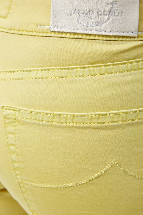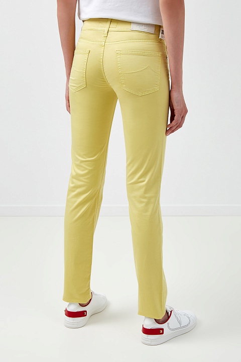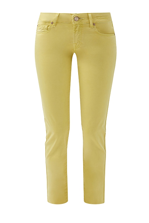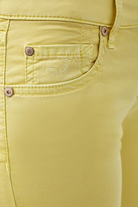 Яркие женские джинсы slim fit от Jacob Cohen выполнены из эластичного хлопкового денима однородного желтого цвета. Модель с прострочкой тамбурным швом в тон и особой пропиткой с изысканным ароматом. Изделие с фирменной, искусственно состаренной, фурнитурой. Застежка осуществляется на молнию и пуговицу. На конструктивный пояс пристрочены шлевка-петли для ремня. В комплекте прилагается специальный платок, которым необходимо протирать кнопки, заклепки и пуговицы. Произведено в Италии.