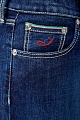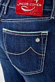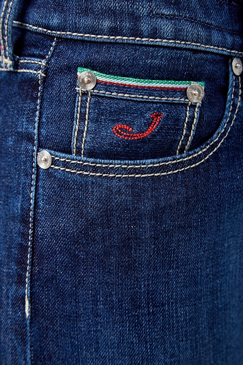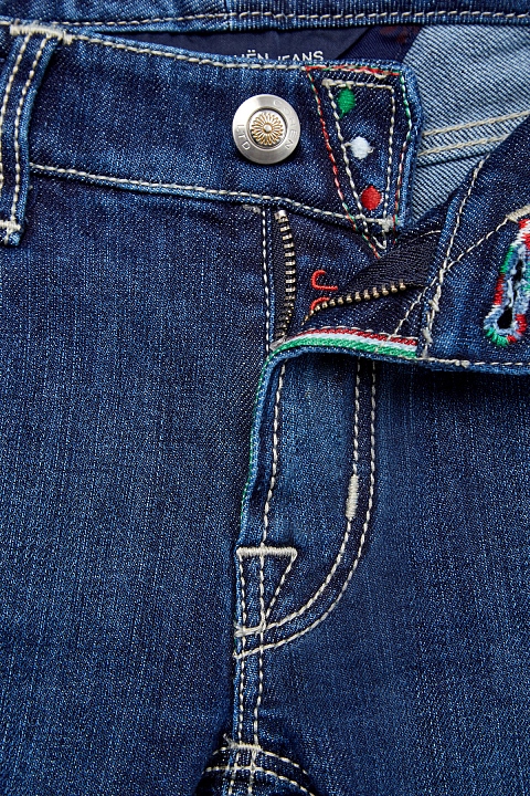 Классические джинсы super slim fit от Jacob Cohen облегающего кроя выполнены из эластичного хлопкового денима синего цвета с потертостями. Модель с прострочкой тамбурным швом голубой нитью и особой пропиткой с изысканным ароматом. Изделие с фирменной фурнитурой "Silver-plated", которая покрывается тонким слоем серебра. Застежка осуществляется на молнию и пуговицу. На конструктивный пояс пристрочены шлевка-петли для ремня. В комплекте прилагается специальный платок, которым необходимо протирать кнопки, заклепки и пуговицы. Кромки карманов украшены цветной строчкой в цвет итальянского флага. Произведено в Италии.