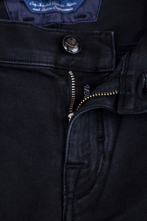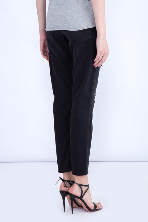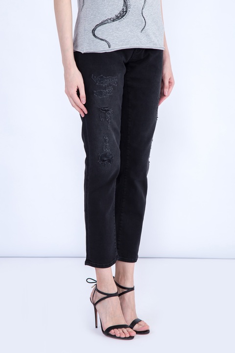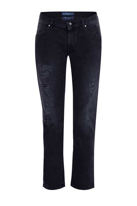 Укороченные женские джинсы Karen Jacob Cohen прямого кроя, выполненные из эластичного хлопкового денима черного цвета с легким высветлением, потертостями и прорезями. Модель с прострочкой тамбурным швом и особой пропиткой с изысканным ароматом. Изделие с фирменной фурнитурой "Silver-plated", которая покрывается тонким слоем серебра. Застежка осуществляется на молнию и пуговицу. В комплекте прилагается специальный платок, которым необходимо протирать кнопки, заклепки и пуговицы. Сделано в Италии.