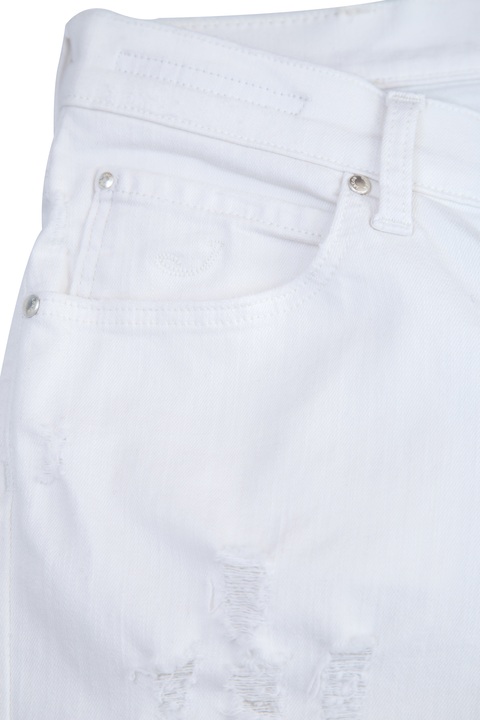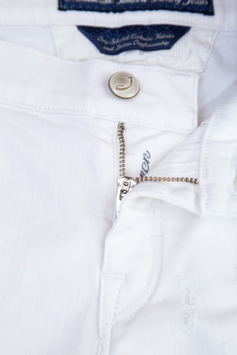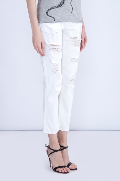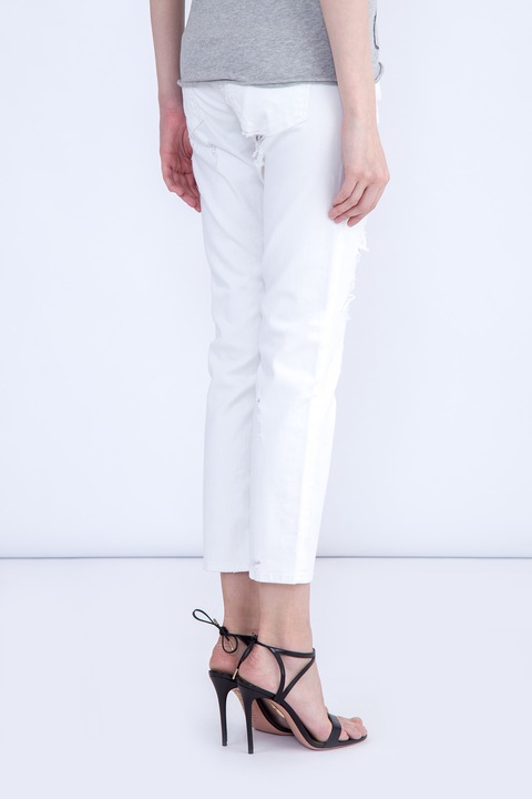 Укороченные женские джинсы Karen Jacob Cohen прямого кроя, выполненные из эластичного хлопкового денима белоснежного цвета с декоративными прорезями и потертостями. Модель с прострочкой тамбурным швом и особой пропиткой с изысканным ароматом. Изделие с фирменной фурнитурой "Silver-plated" с винтажным эффектом, которая покрывается тонким слоем серебра. Застежка осуществляется на молнию и пуговицу. В комплекте прилагается специальный платок, которым необходимо протирать кнопки, заклепки и пуговицы. Сделано в Италии.