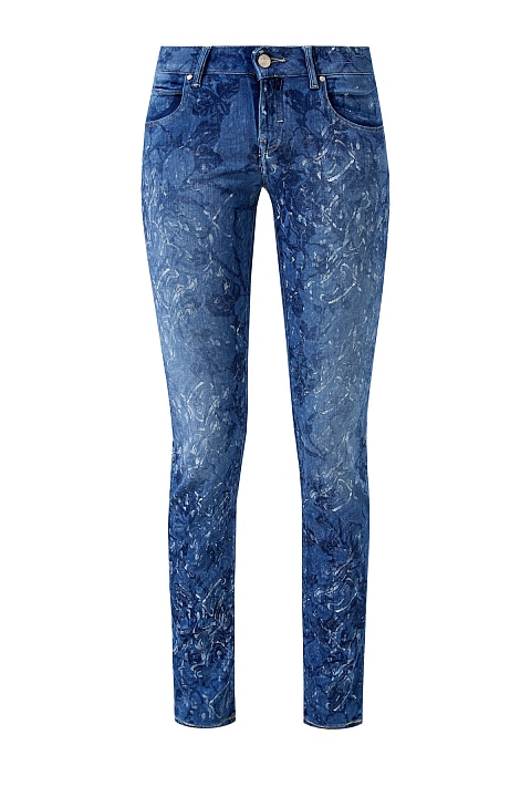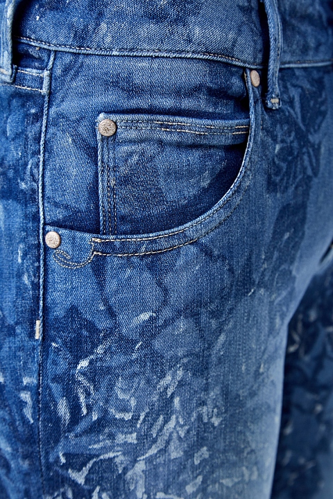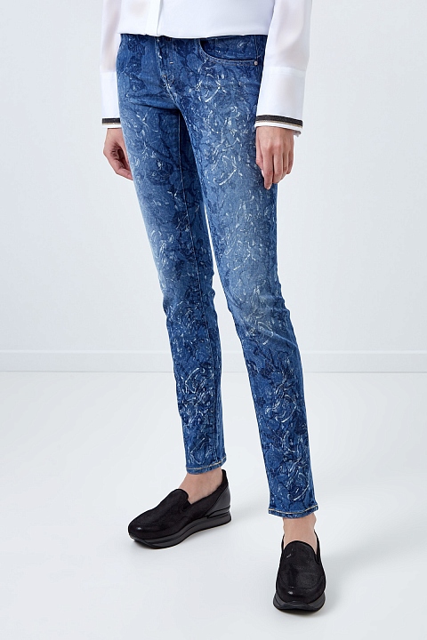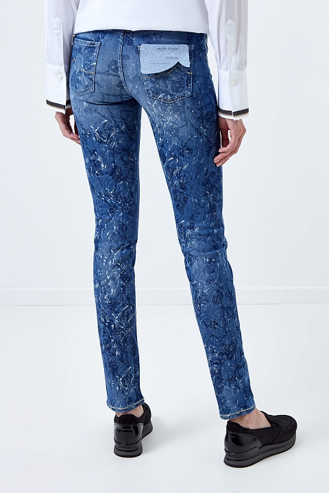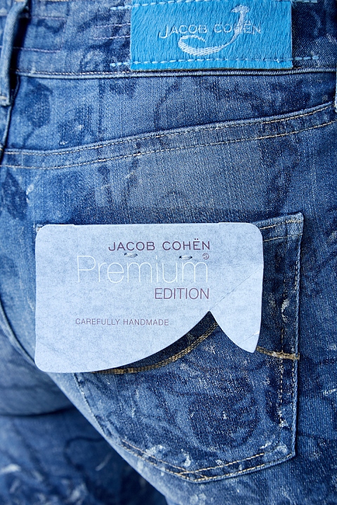Стильные джинсы Jacob Cohen зауженного кроя, выполненные из сочетания натуральных тканей таких как, вискоза и хлопок, неравномерно окрашенных в синий цвет. По всему полотну имеется декоративный набивной принт с цветочным узором. Модель с контрастной прострочкой тамбурным швом и особой пропиткой с изысканным ароматом. Изделие с фирменной фурнитурой "Silver-plated", которая покрывается тонким слоем серебра. Застежка осуществляется на молнию и пуговицу. На конструктивный пояс пристрочены шлевка-петли для ремня. В комплекте прилагается специальный платок, которым необходимо протирать кнопки, заклепки и пуговицы. Сделано в Италии.