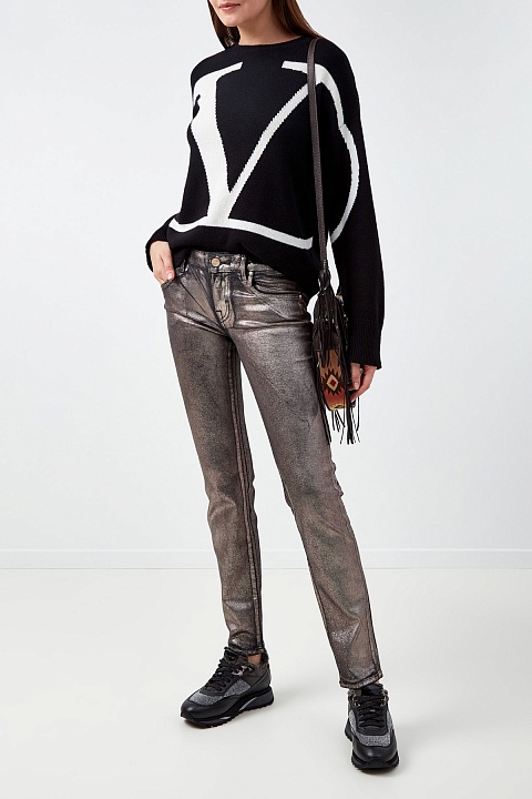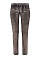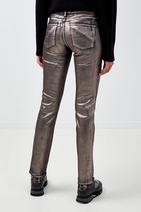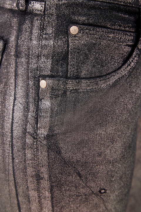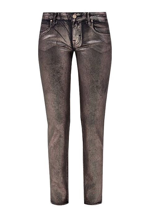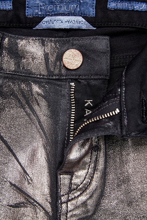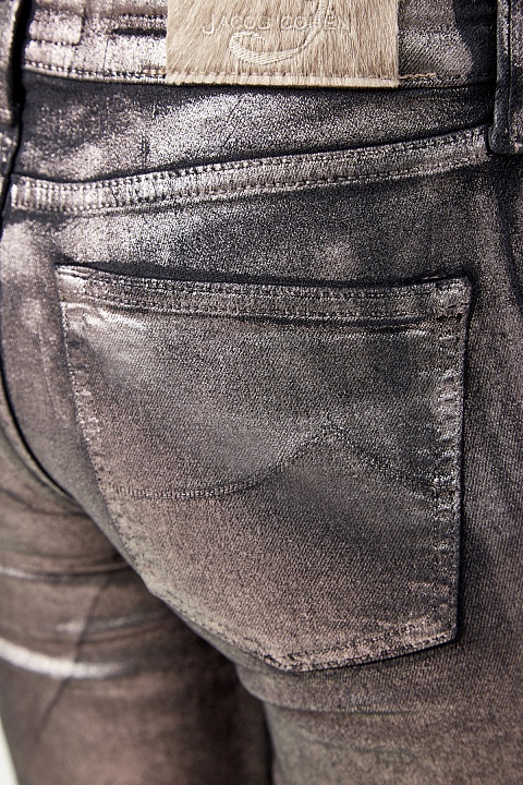 Эффектные женские джинсы slim fit от Jacob Cohen облегающего кроя выполнены из плотного хлопкового денима черного цвета со сплошным серебристым напылением. Модель с прострочкой тамбурным швом и особой пропиткой с изысканным ароматом. Изделие с фирменной фурнитурой "Silver-plated", которая покрывается тонким слоем серебра. Застежка осуществляется на молнию и пуговицу. На конструктивный пояс пристрочены шлевка-петли для ремня. В комплекте прилагается специальный платок, которым необходимо протирать кнопки, заклепки и пуговицы. Сделано в Италии.