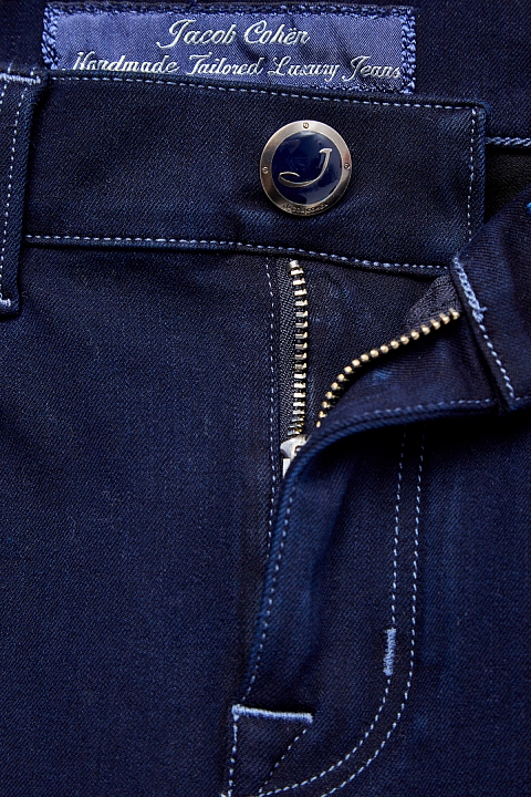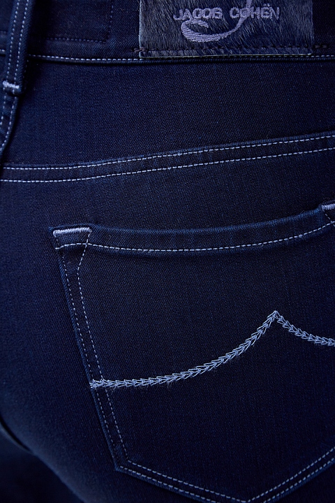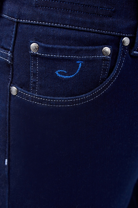 Зауженные джинсы Gilda от Jacob Cohen выполнены вручную из японского хлопкового денима Kurabo. Оттенок индиго достигнут без использования химических красителей ни на одной из 45 ступеней окрашивания. Пуговицы покрыты серебряным напылением «Silver-plated» и декорированы тисненой символикой бренда. Специальный платок для ухода за фурнитурой предоставляется в комплекте. Сделано в Италии.