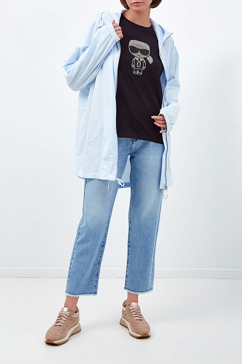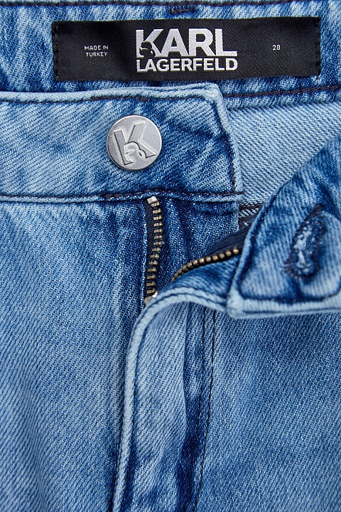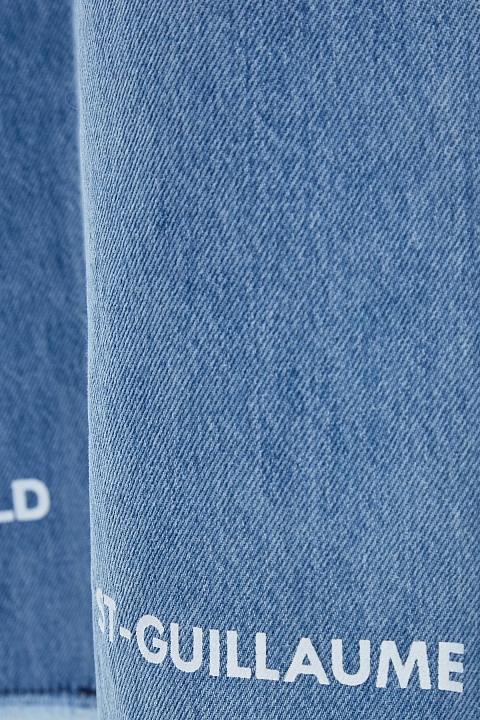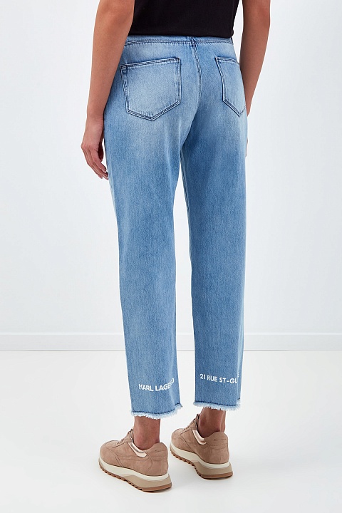 Классические прямые джинсы от Karl Lagerfeld выполнены из плотного денима с выбеленным эффектом «делаве». Неформальный стиль изделия подчеркивают необработанне края. Модель дополнена текстовым принтом Rue St-Guillaume и аппликацией с логотипом бренда. Детали: застежка на молнию и фирменную пуговицу, пять карманов.