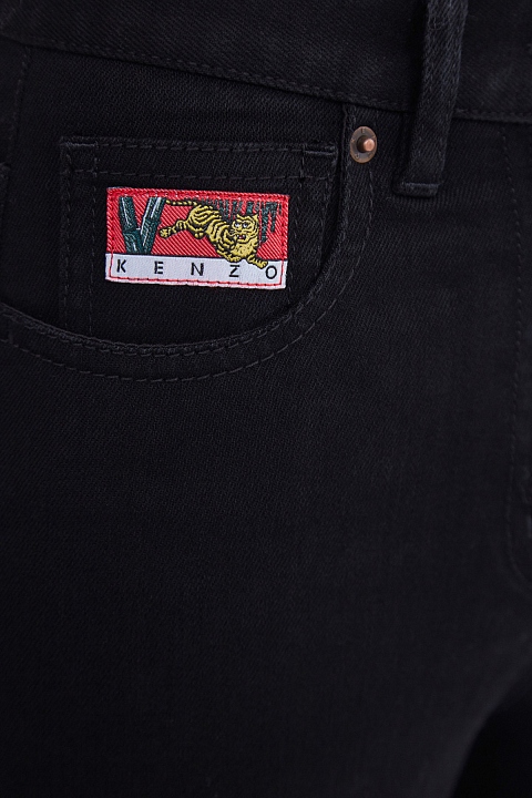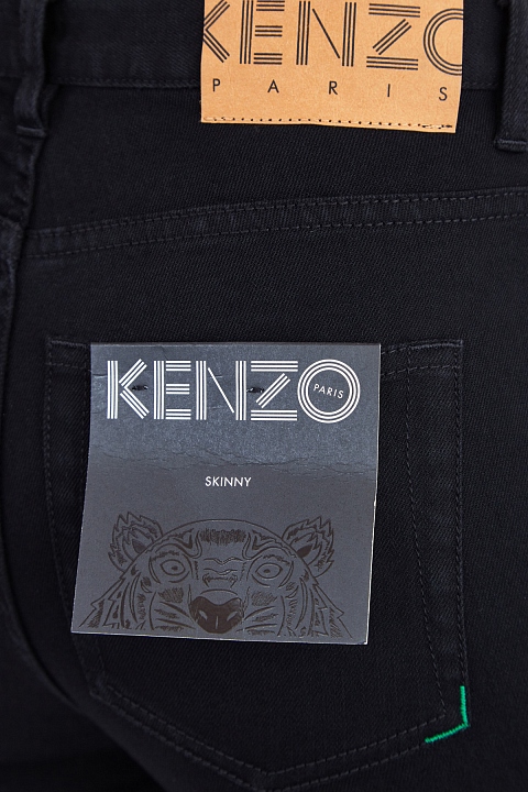 Стильные джинсы кроя скинни от Kenzo выполнены из плотного хлопкового денима в базовом черном цвете. Контрастные акценты в образе расставляет лаконичная вышивка нитью зеленого оттенка на спинке. Модель декорирована нашивками с фирменной символикой на кармане, а также притачном поясе с петлями для ремня. Детали: застежка на брендированную пуговицу и молнию, традиционные пять карманов.