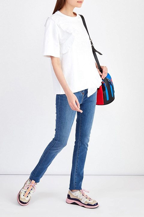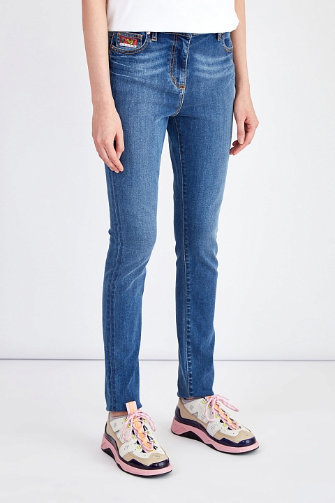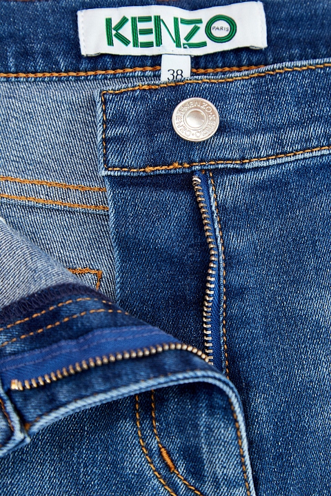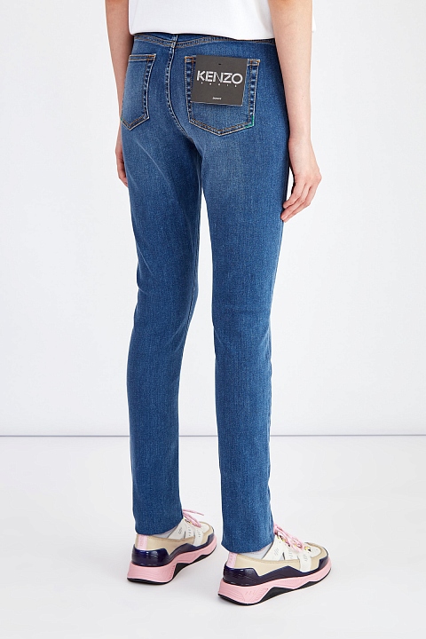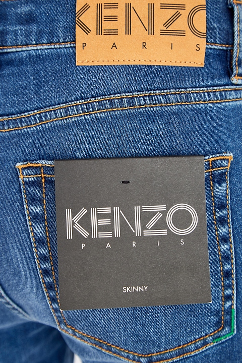 Облегающие джинсы-skinny от Kenzo выполнены в классическом голубом оттенке из плотного хлопкового денима с эффектом потертости. Цветовой акцент в образ вносит декоративная прострочка на спинке, созданная в насыщенном зеленом оттенке. Модель оснащена притачным поясом с петлями для ремня, традиционными пятью карманами и застежкой на пуговицу и молнию. Нашивка «Bamboo Tiger» завершает дизайн.