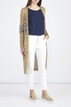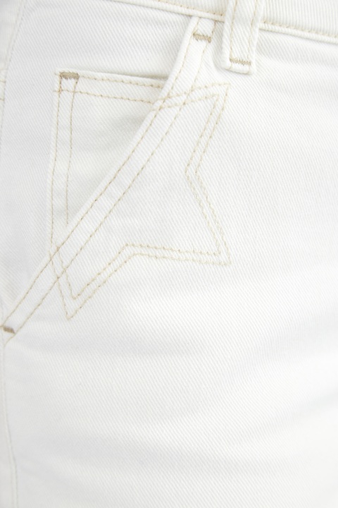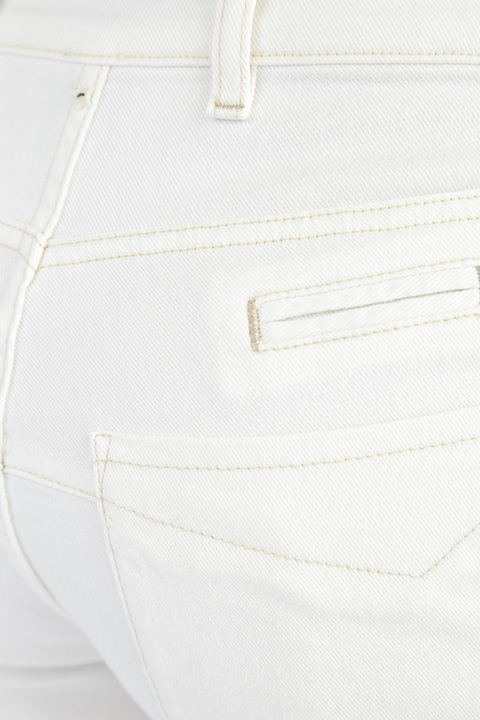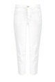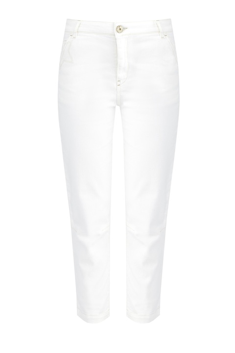 Лаконичные джинсы длины ⅞ от Lorena Antoniazzi выполнены из плотного фактурного денима молочного оттенка и дополнены прострочкой швов нитью контрастного тона. Фирменный стиль подчеркнут вышивкой в виде символики бренда на передней планке. Высокая посадка формирует гармоничный силуэт, а вытачки в области колен придают образу легкую небрежность. Сделано в Италии.