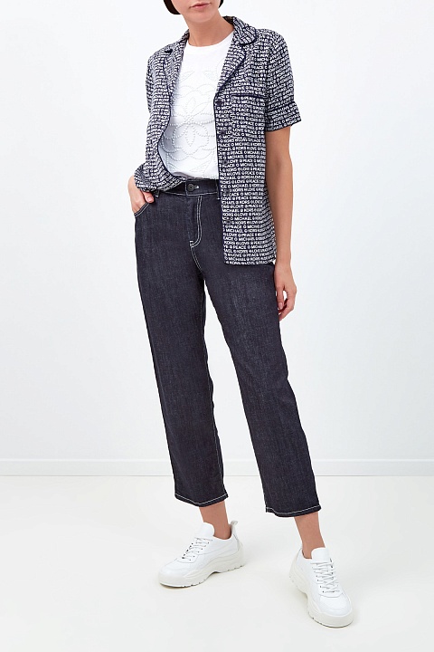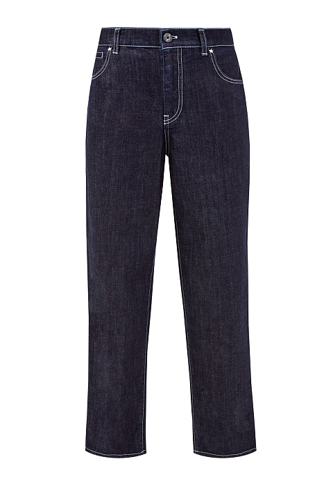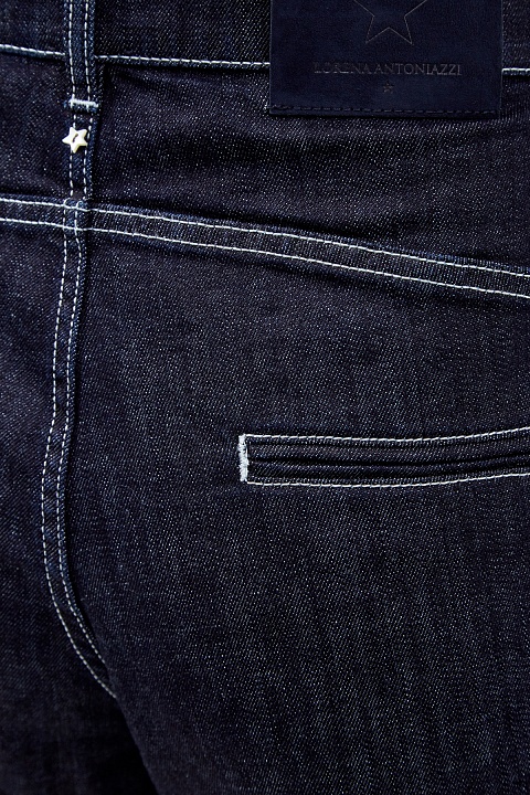 Джинсы комфортного прямого кроя от Lorena Antoniazzi выполнены из хлопкового денима в оттенке индиго. Прострочка швов контрастной нитью визуально структурирует силуэт. Модель с завышенной линией талии дополнена традиционными пятью карманами. Детали: застежка на пуговицу и молнию, символика бренда из перламутра на спинке. Сделано в Италии.