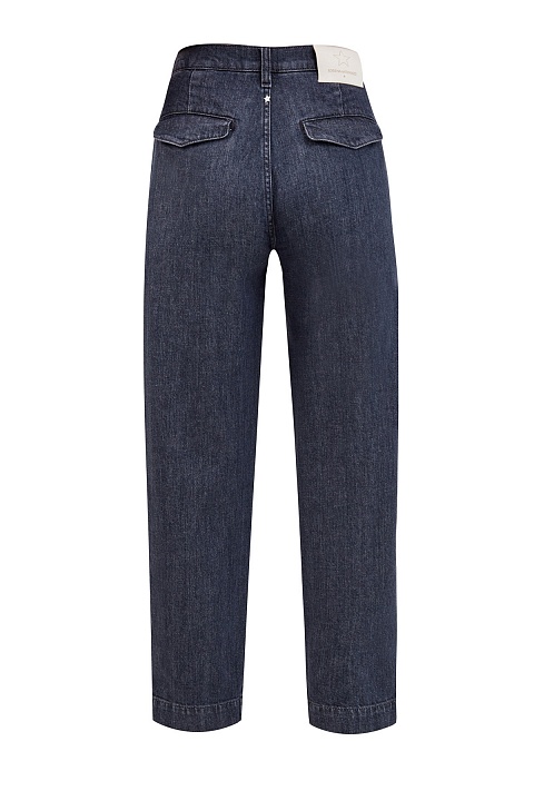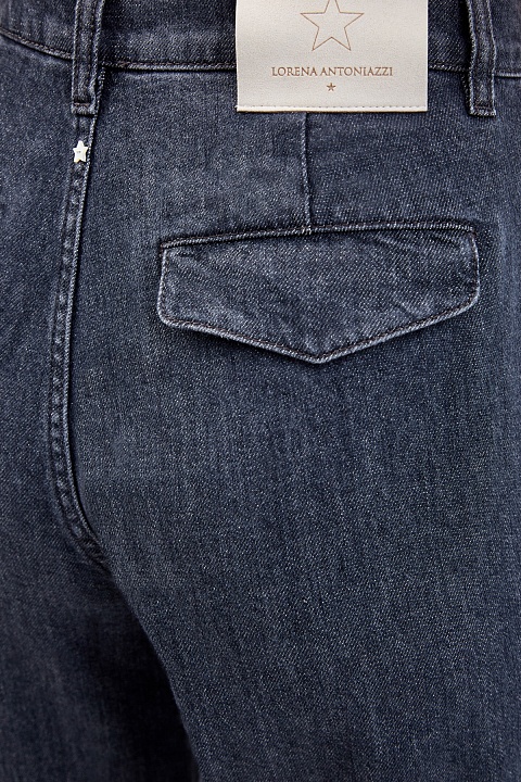 Базовые джинсы слегка укороченного кроя от Lorena Antoniazzi выполнены в оттенке индиго. Плотный хлопковый деним с добавлением эластана не стесняет движений. Оригинальные застежки по нижнему краю дополнены кнопками и придают объем. На спинке — прорезные карманы с клапанами в стиле ретро. Детали: застежка на пуговицу и молнию, прострочка швов в тон, нашивка из кожи на поясе. Сделано в Италии.