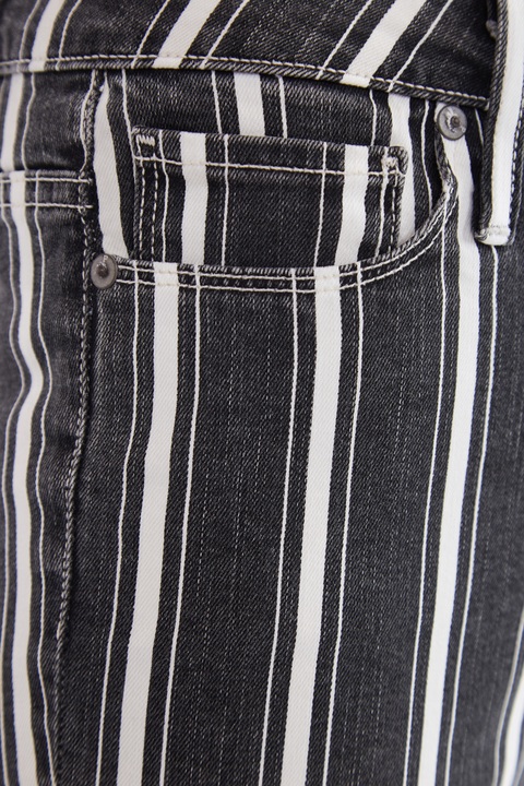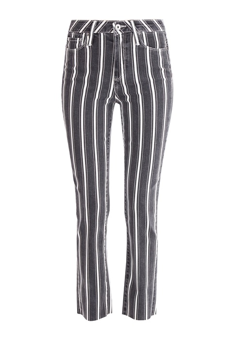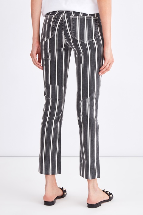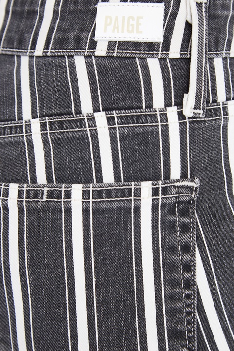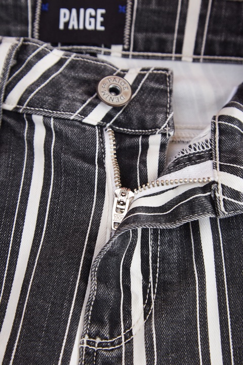 Эффектные женские джинсы бренда Paige изготовлены из хлопкового денима по уникальной технологии TRANSCEND, которая обеспечивает комфортную мягкость, надежную фиксацию и удобную посадку. Модель укороченного кроя с легким расклешением у необработанных нижних кромок характеризуется полосатым узором в черно-белой гамме. Застежка осуществляется на молнию и пуговицу с тиснением Модного дома.