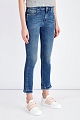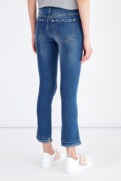 Укороченные расклешенные джинсы с бахромой и потертостями
