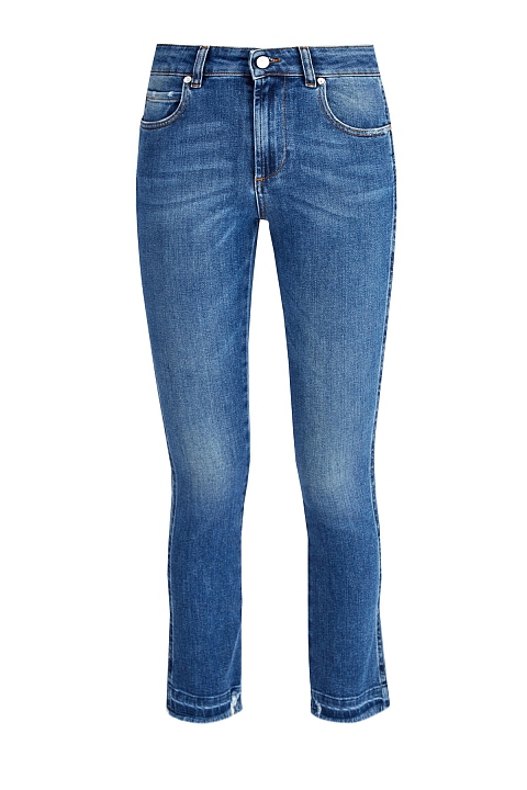 Укороченные джинсы от REDValentino выполнены из эластичного хлопкового денима с выбеленным эффектом и дополнены прострочкой швов нитью табачного оттенка. Модель на традиционной посадке декорирована бахромой по нижним кромкам, которая вместе с декоративными потертостями вносит в образ нотку расслабленного стиля. Детали: слегка расклешенный книзу крой, традиционные пять карманов, застежка на пуговицу и молнию.