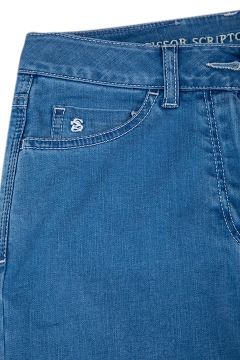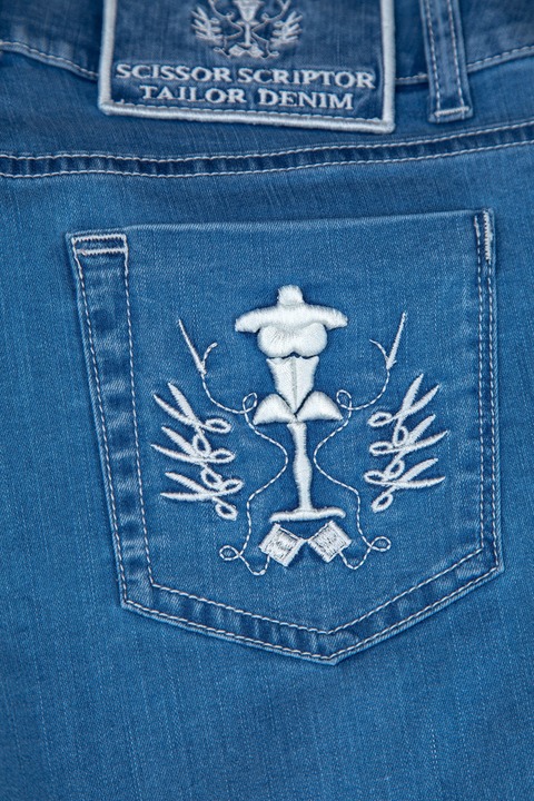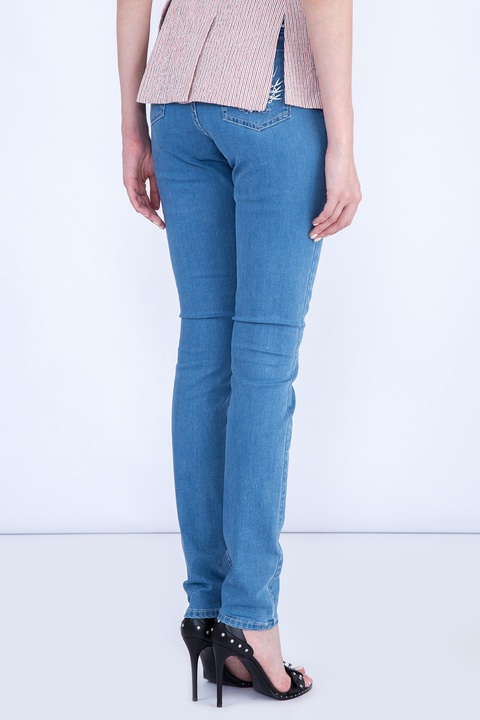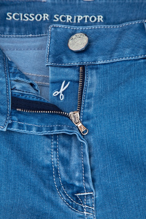 Женские джинсы Scissor Scriptor кроя skinny, выполненные из хлопкового денима голубого цвета с укреплением синтетическими волокнами. Модель характеризуется посадкой на завышенной линии талии на притачном поясе и пятью карманами. Задний карман и карман для монет декорированы искусной вышивкой с символикой бренда. Застежка осуществляется на молнию и пуговицу, которые полируются вручную. Сделано в Италии.