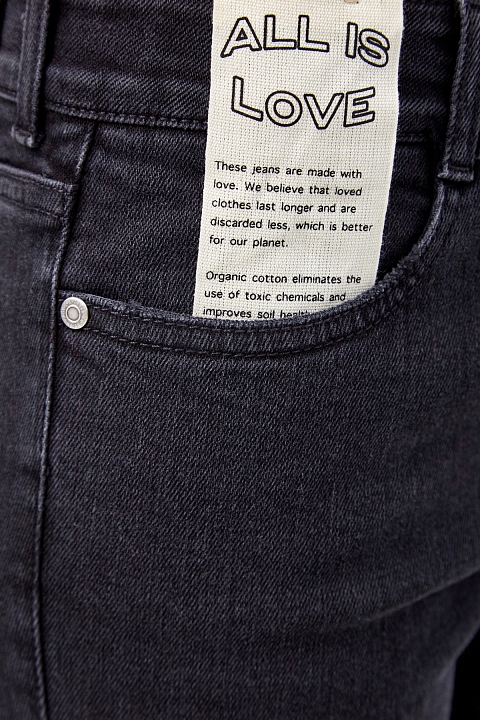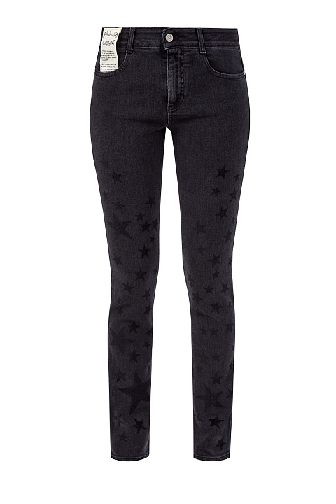Базовые джинсы-скинни от Stella McCartney выполнены в оттенке «графит» из плотного денима с легким выбеленным эффектом. Эластичные волокна в составе обеспечивают комфорт в движении. Ярким акцентом в образе стал бархатный принт в виде звезд. Детали: классическая средняя посадка, застежка на пуговицу и молнию.