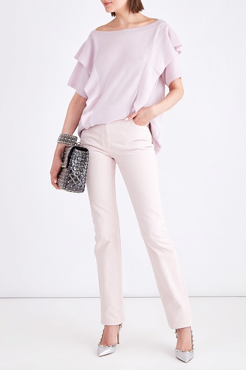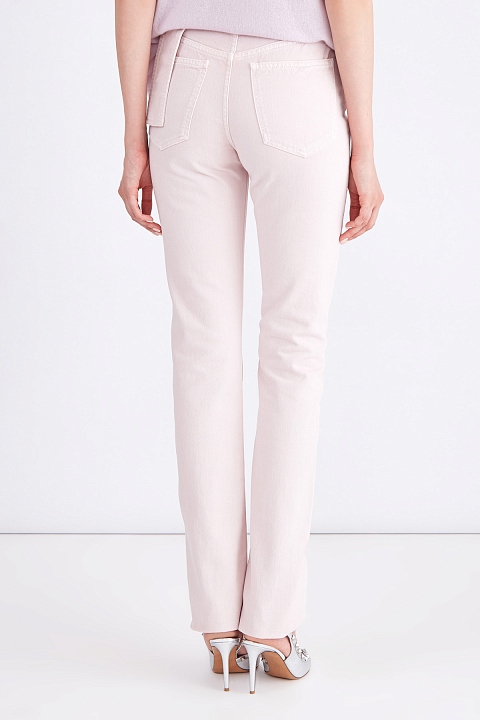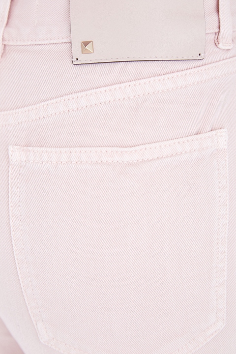 Минималистичные женские джинсы прямого кроя из весенне-летней коллекции Valentino выполнены из прочного хлопкового денима пастельного нежно-розового тона. Модель дополнена фурнитурой в оттенке розового золота, а также застежкой на пуговицу и молнию с серебристым напылением. Традиционные пять карманов и притачной пояс петлями и хлястиком, имитирующим заправленный ремень завершают изделие. Сделано в Италии.