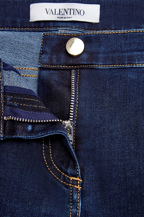Классические джинсы прямого кроя от Valentino выполнены из денима stretch. Однородный оттенок индиго дополнен контрастной прострочкой швов и фурнитурой с золотистым напылением. Дань традициям и истории Модного дома — литая символика «V» на спинке. Накладные карманы создают настроение в стиле ретро. Детали: комфортная средняя посадка, застежка на пуговицу и молнию. Сделано в Италии.