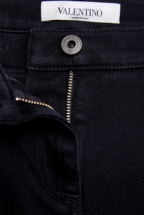 Классические джинсы прямого кроя от Valentino выполнены из хлопкового денима, выверенный процент синтетических волокон в составе обеспечивает свободу в движении. Однородный угольно-черный оттенок дополнен прострочкой швов в тон. На спинке — контрастная аппликация VLTNSTAR, ставшая знаковой для весенне-летней коллекции. Детали: комфортная средняя посадка, застежка на пуговицу и молнию. Сделано в Италии.