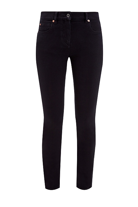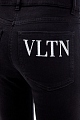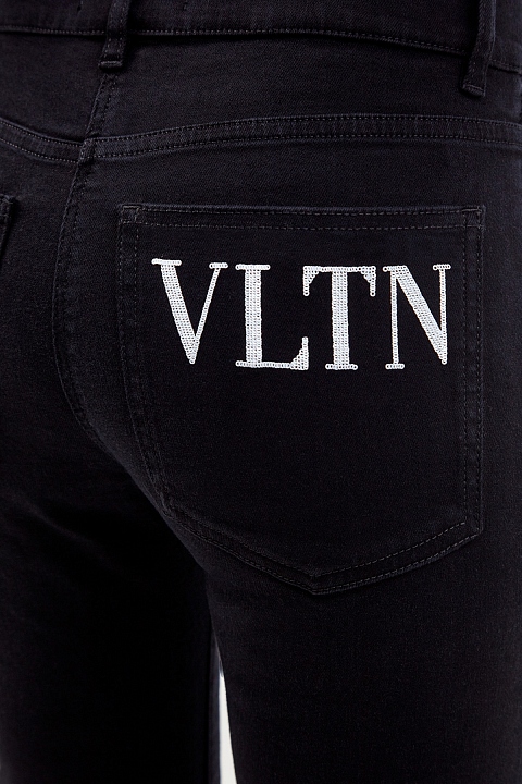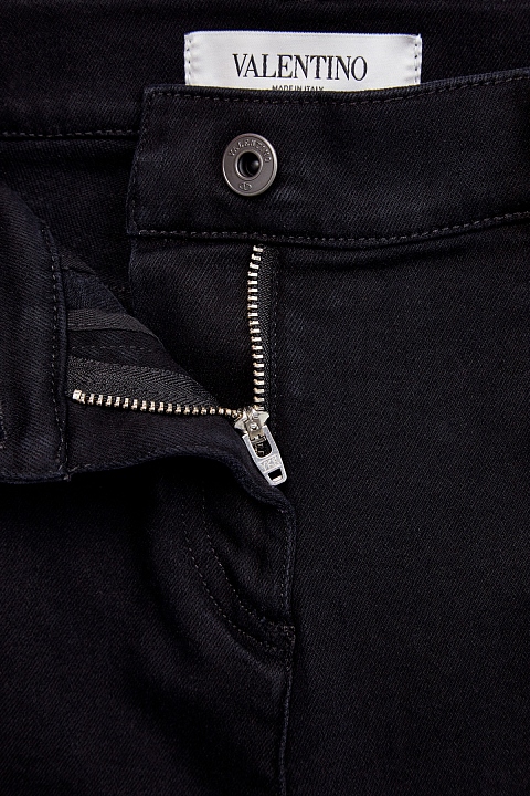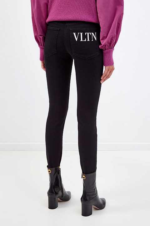 Облегающие джинсы-skinny от Valentino созданы из эластичного денима в универсальном черном цвете. Однородный оттенок дополнен прострочкой швов нитью в тон и фурнитурой с медным напылением. Легкий эффект потертости и завышенная линия талии придают образу расслабленный акцент. Фирменный штрих Модного Дома — контрастный принт Vlogo Signature на спинке. Детали: застежка на молнию и брендированную пуговицу на передней планке, пять карманов. Сделано в Италии.