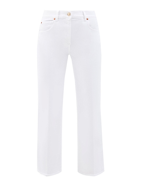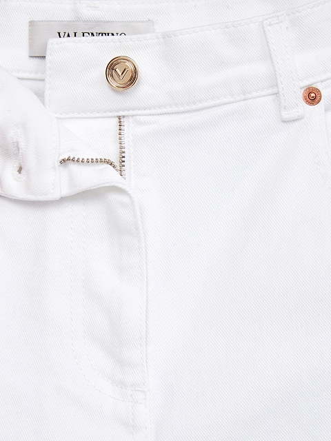 Лаконичные джинсы от Valentino выполнены из плотного денима — благодаря эластичным волокнам в составе ткань остается комфортной в движении. Элемент фирменной роскоши — отделка VGOLD на карманах на спинке, литые детали покрыты напылением цвета античного золота. Прямой силуэт с высокой линией талии делает модель максимально универсальной. Детали: заклепки с фирменным тиснением, застежка на пуговицу и молнию, пояс с петлями для ремня. Сделано в Италии.