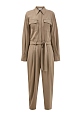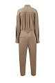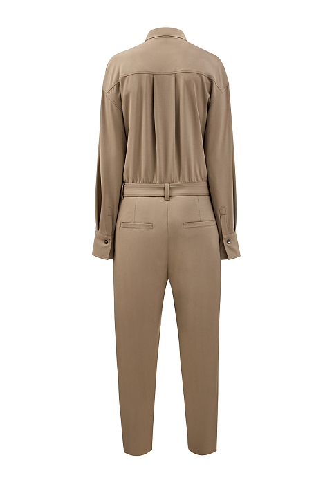 Комбинезон из шерстяной ткани stretch от Brunello Cucinelli создан в натуральном бежевом оттенке. Спущенная линия плеч и заложенные складки подчеркивают расслабленное настроение в стиле sprezzatura. Пояс визуально структурирует силуэт, отложной ворот потайная застежка придают образу строгость. Детали: прорезные карманы, длинные рукава с манжетами, зауженный книзу крой брючин. Сделано в Италии.