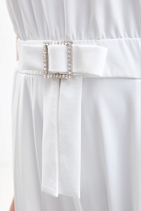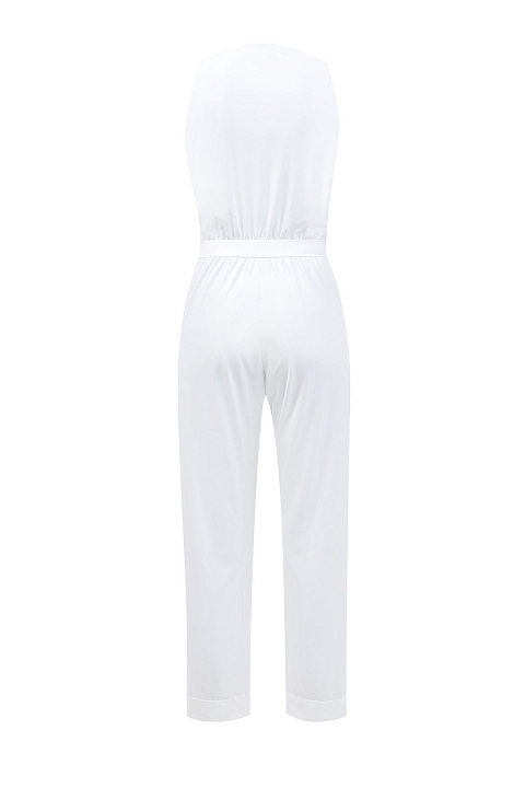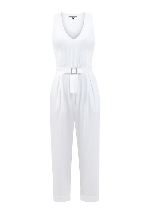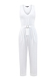 Однотонный комбинезон длины макси из коллекции Beachwear от Fisico полностью выполнен в белоснежном оттенке. Модель из гладкого эластичного материала, стойкого к выцветанию и хлору, идеально подходит для пляжных аутфитов. Пояс изделия оформлен декоративным бантом с пряжкой из серебристых стразов. Прорезные карманы по бокам и легкие заложенные складки завершают дизайн. Детали: вытачки для посадки по фигуре, V-образный вырез, приталенный крой.