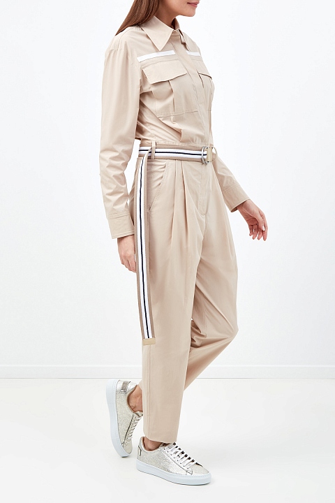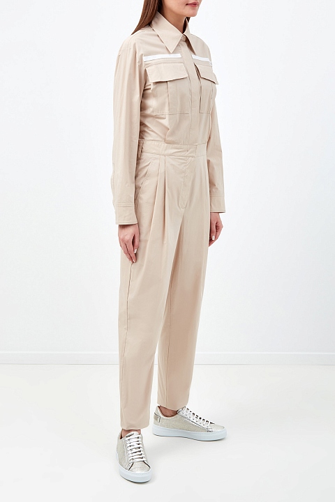 Комбинезон от Lorena Antoniazzi выполнен из натурального хлопка — легкая и дышащая ткань универсальна для летнего сезона. Нотки стиля сафари в образ вносят клапаны на карманах. Приталенный силуэт подчеркнут заложенными складками, а контрастная лента придает динамику и позволяет сочетать изделие в том числе со спортивной обувью. Детали: перламутровая символика на спинке, прорезные карманы по бокам, потайная застежка на пуговицы. Сделано в Италии.