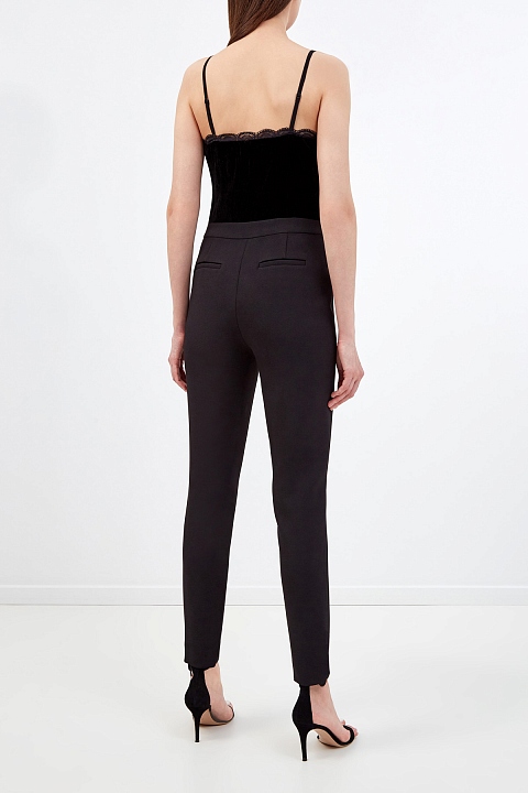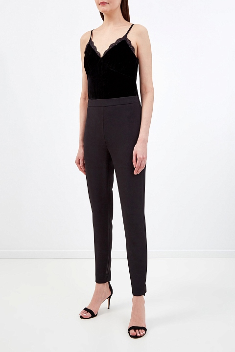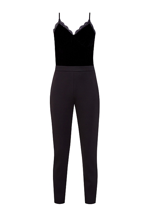 Элегантный комбинезон от MICHAEL Michael Kors выполнен в черном цвете. Лиф из велюра с богатой, поглощающей свет фактурой, украшен нежным кружевом по линии декольте. Брюки из струящейся костюмной ткани дополнены вытачками для максимально точной посадки по фигуре. Детали: тонкие бретели, застежка на потайную молнию.
