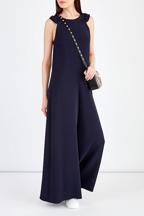 Элегантный комбинезон от REDValentino выполнен из струящейся костюмной ткани в глубоком оттенке сапфира. Фирменный романтичный образ создает отделка ворота воздушными оборками, а заниженный средний шов придает крою элемент стиля спортшик. Детали: расклешенные струящиеся брюки, прорезные карманы по бокам, застежка на потайную молнию.