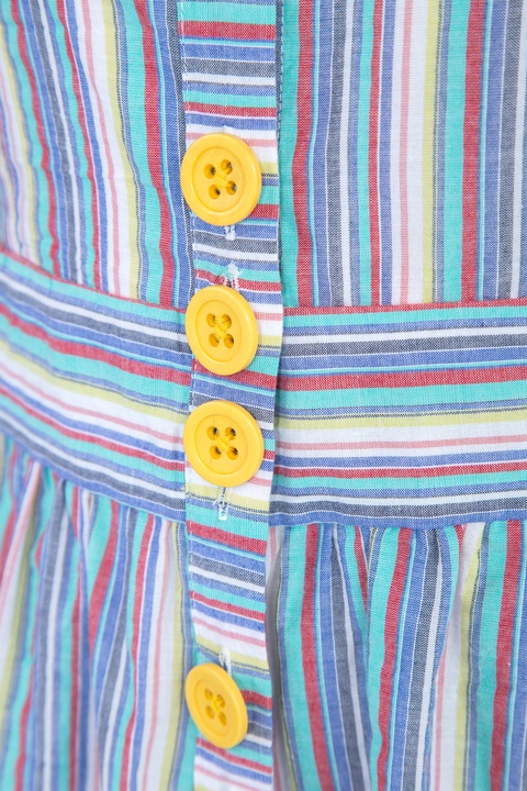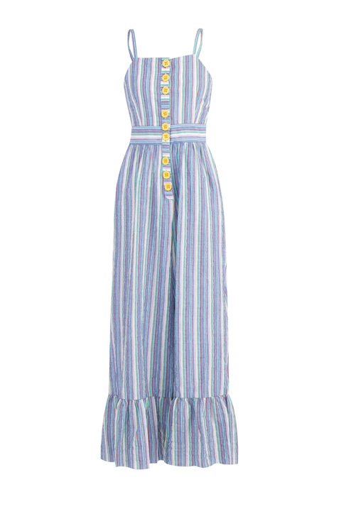 Яркий женский комбинезон See By Chloe, выполненный из эластичного хлопка с узором в полоску. Модель на тонких бретельках с брюками свободного кроя, дополненными притачными кромками с мягкими складками. Талию подчеркивает втачной пояс в тон. Образ завершает ряд пуговиц ярко-желтого тона.