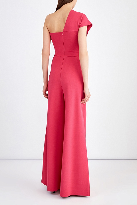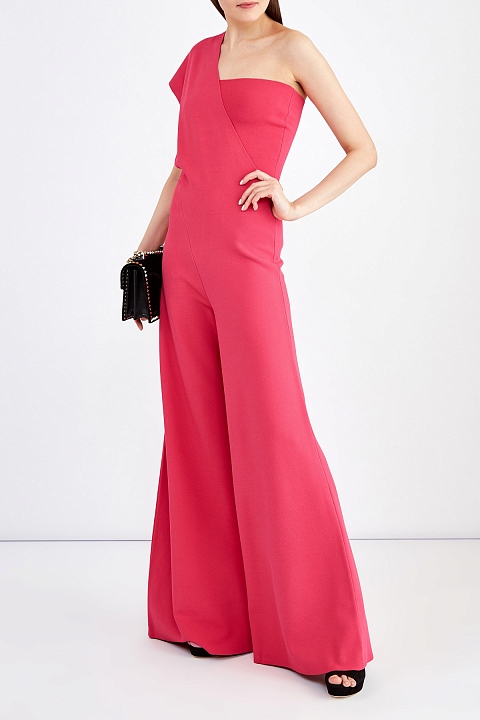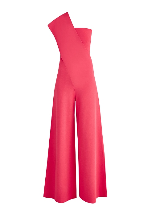 Яркий комбинезон от Stella McCartney выполнен из струящейся ткани насыщенного оттенка фуксии — благодаря эластичным волокнам в составе и плотному расположению петель материал обладает эффектом моделирования силуэта. Модель сложного кроя с лифом-бандо дополнена широкой бретелью на одно плечо, а также расклешенными от бедра брюками. Потайная застежка-молния на спинке завершает лаконичный дизайн.