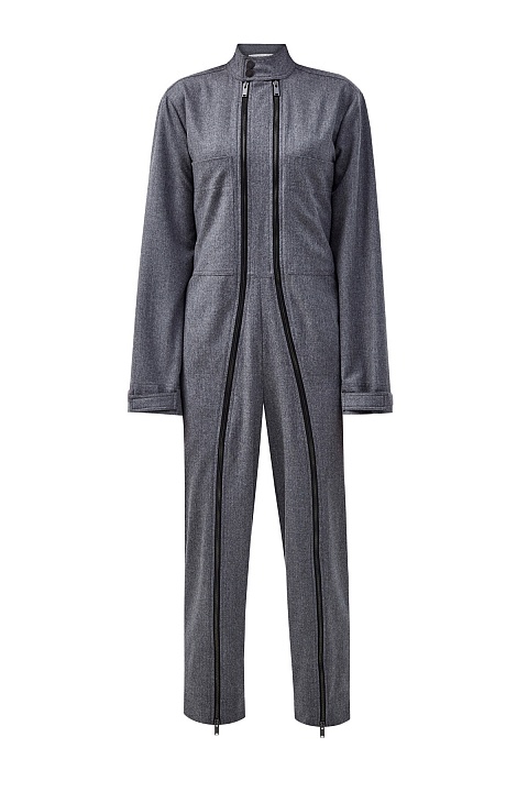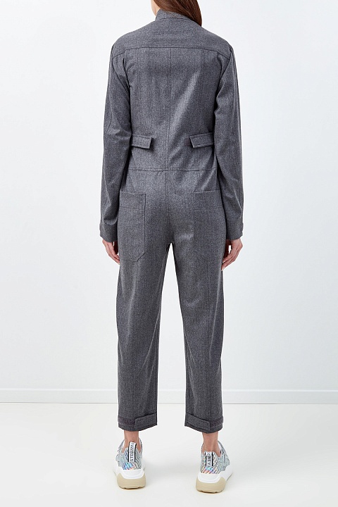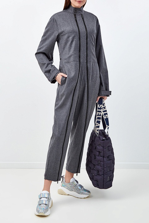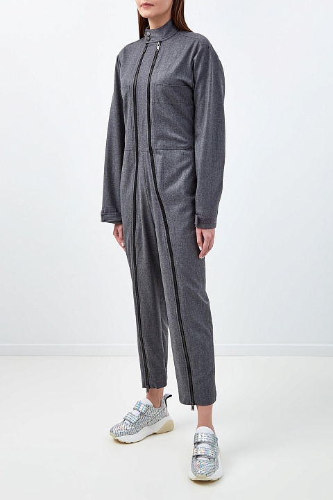 Эффектный комбинезон силуэта oversize от Stella McCartney выполнен из держащей форму шерстяной ткани. Объемный крой лифа дополнен зауженными книзу брюками длины ⅞. Застежки-молнии вдоль планок визуально вытягивают силуэт. Детали: накладные карманы в стиле карго, хлястики на талии и манжетах, высокий ворот на кнопках, фурнитура с напылением серебристого оттенка.