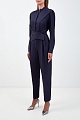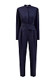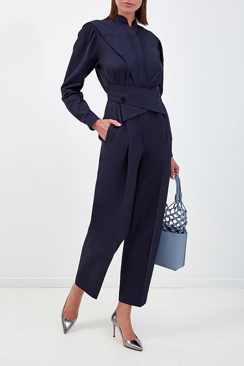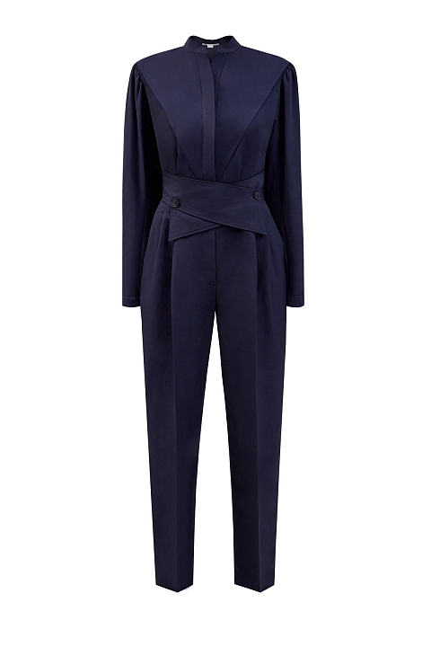 Оригинальный комбинезон от Stella McCartney выполнен из плотного хлопка в глубоком темно-синем цвете. Благодаря волокнам льна в составе материал идеально подходит для летнего сезона. Приталенный силуэт подчеркнут поясом из двух диагональных панелей на пуговицах. Зауженный нижний край брюк позволяет сочетать актуальную модель с босоножками, туфлями и кроссовками. Детали: застежка на молнию и пуговицы на передней планке, длинные рукава, заложенные складки от плечевых швов.