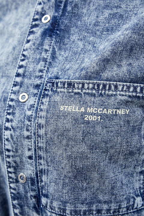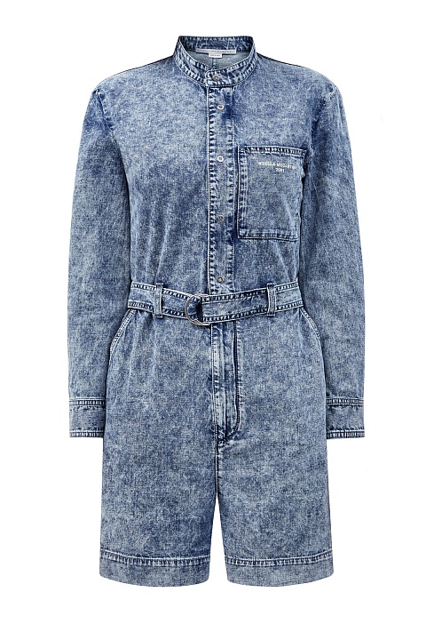 Джинсовый комбинезон от Stella McCartney полностью выполнен из органического хлопка с эффектом кислотной стирки. Лаконичная модель с шортами и длинными рукавами дополнена воротником-стойкой. Пояс с D-образными фиксаторами образует приталенный силуэт. Детали: застежка на кнопки, нагрудный карман с принтом «Stella McCartney 2001», два кармана по бокам.